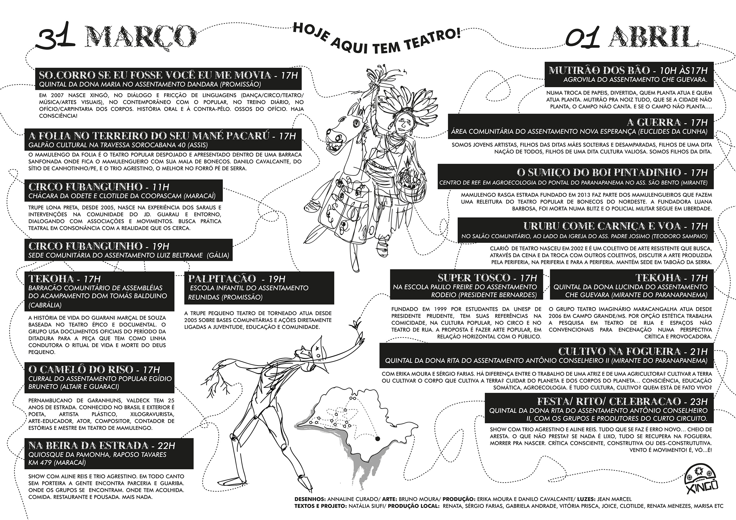 Há sete anos o Grupo Xingó, vem desenvolvendo um mapeamento do que nomeamos territórios de resistência, no interior do Estado de São Paulo, a partir da circulação de seus trabalhos por comunidades rurais, quilombos, cooperativas de catadoras de resíduos e assentamentos de movimentos sem terra. Espaços de resistência, que em sua maioria, nunca receberam atividade artística. Nos últimos quatro anos, fomos convidando parceiros de outros coletivos de teatro para circularem conosco nesses espaços, por acreditarmos que a troca de experiências com essas e esses trabalhadores, envolvidos em movimentos sociais de luta, é fundamental tanto para alimentá-los de nossa cultura aguerrida, que se dispõe a contribuir com o imaginário de nossa classe, quanto para os grupos que se posicionam à esquerda, fazem teatro combativo, e muitas vezes não conhecem a realidade das lutas dentro desses espaços, distantes da capital.
